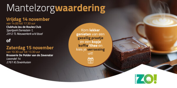 Op 10 november is het de Dag van de Mantelzorg. Steunpunt Mantelzorg van Stichting ZO! wil alle mantelzorgers in Zuidplas laten zien dat hun inzet wordt gewaardeerd. Daarom is er op vrijdag 14 en zaterdag 15 november een speciaal waarderingsmoment….