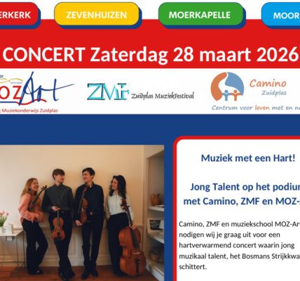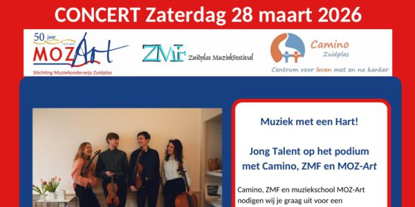Op zaterdag 28 maart 2026 vindt in Nieuwerkerk aan den IJssel de tweede editie plaats van het concert Muziek met een Hart. Dit bijzondere initiatief van Camino, MOZ-Art en het Zuidplas MuziekFestival biedt jong muzikaal talent een podium én creëert…
