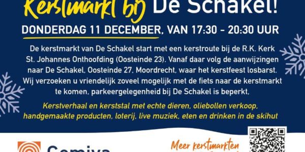 De kerstperiode wordt weer feestelijk afgetrapt bij De Schakel in Moordrecht. Op donderdag 11 december vindt daar voor de 15e keer de traditionele kerstmarkt plaats, van 17.30 tot 20.30 uur. De avond begint met een feestelijke bijeenkomst in de R.K….