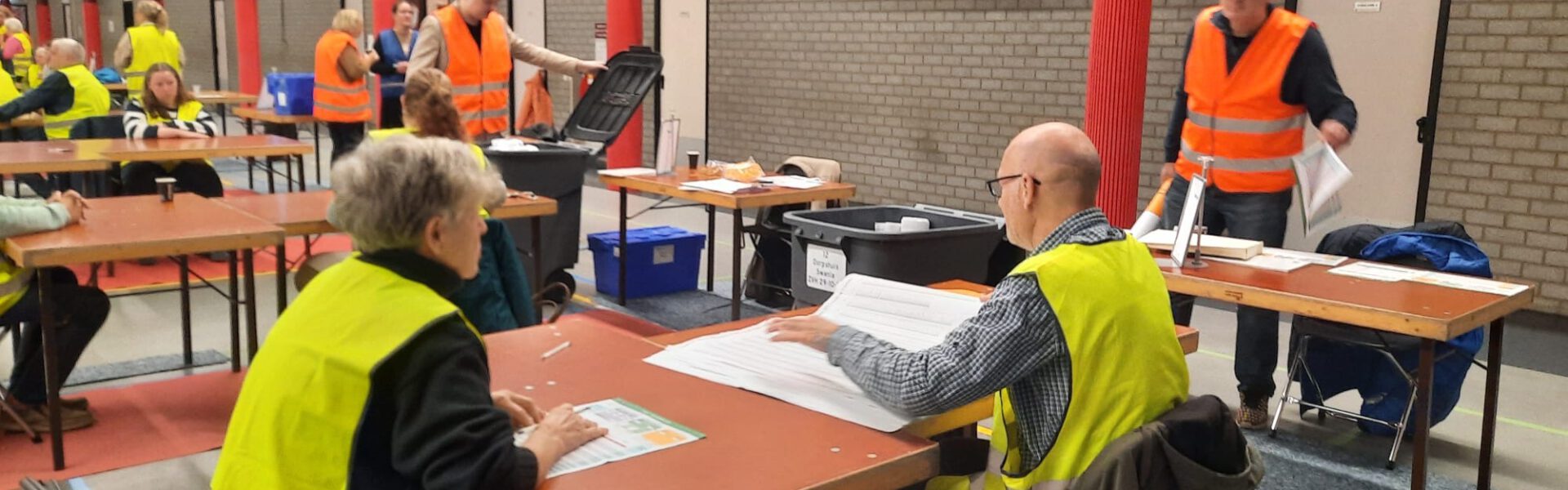 Er waren zo’n 80 tellers en 10 telleiders in de hal aanwezig. Deze personen waren te herkennen aan de kleur van hun hesje. Een van de telleiders, André, doet dit werk al jaren en kent dus het klappen van de zweep. Waarom is het zo leuk om dit werk te doen? André: “Dat je onderdeel uit kunt maken van de democratie en deze kunt controleren.”
