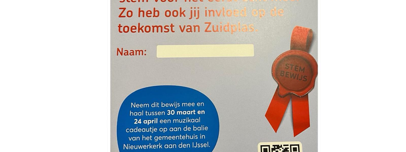 Met dit bewijs kunnen de jonge kiezers volgende maand een klein muzikaal cadeautje ophalen in het gemeentehuis van Zuidplas. De gemeente wil hiermee extra aandacht geven aan het belang van stemmen en jongeren op een positieve manier betrekken bij de lokale democratie.