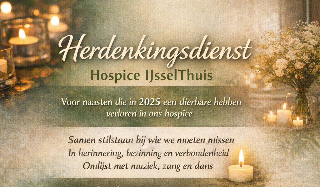 Hospice IJsselThuis organiseert op donderdag 22 januari 2026 een herdenkingsdienst voor naasten die in 2025 een dierbare hebben verloren in het hospice. Tijdens deze bijeenkomst wordt samen stilgestaan bij wie gemist wordt, in een sfeer van herinnering, bezinning en verbondenheid. De herdenking wordt omlijst met muziek, woorden en licht.