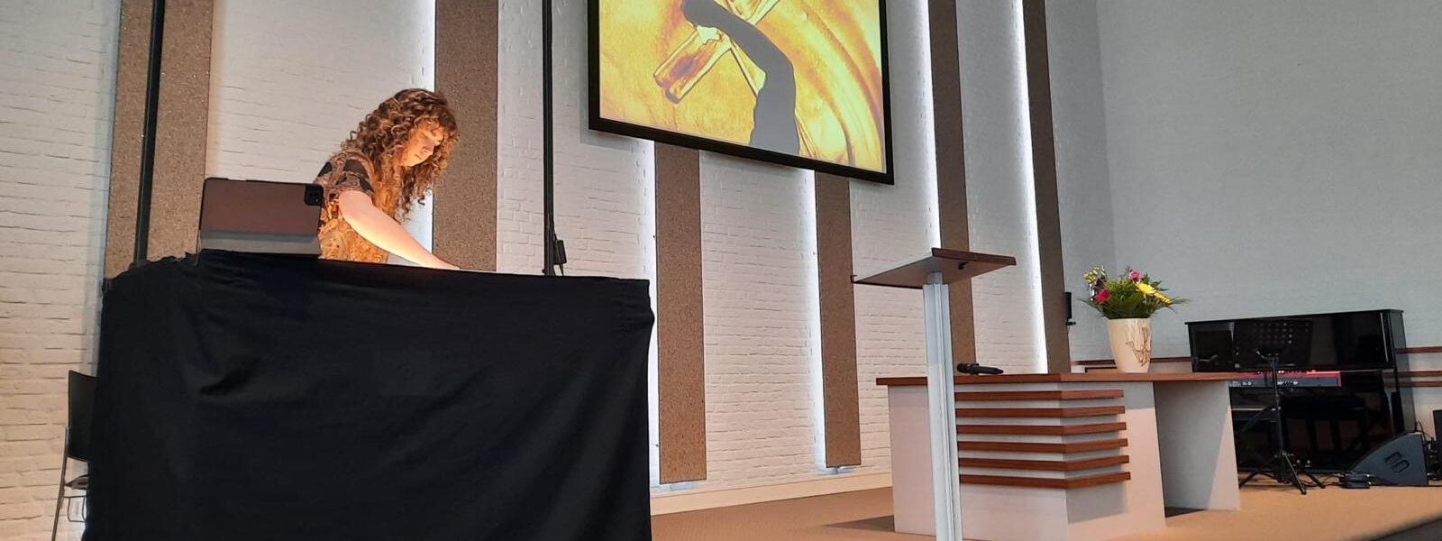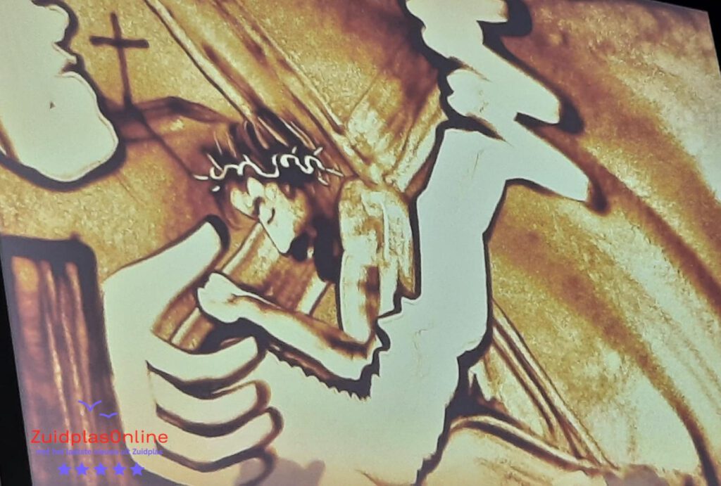 Rosa van der Vijver, de zandkunstenares, bracht het paasverhaal tot leven met zand. Met hulp van haar handen liet zij de afbeeldingen in elkaar overvloeien wat op een groot scherm te zien was. Indrukwekkend om te zien hoe dit in zijn werk ging en wat het eindresultaat was. Te zien was dat zij met zand strooide, het verschoof op een lichtplaat en door haar handen verschenen er allerlei tekeningen. Heel bijzonder, heel pakkend, soms ontroerend kwam zo het paasverhaal tot leven. Daarbij werd ook gebruik gemaakt van muziek wat het tot een compleet verhaal maakte.
