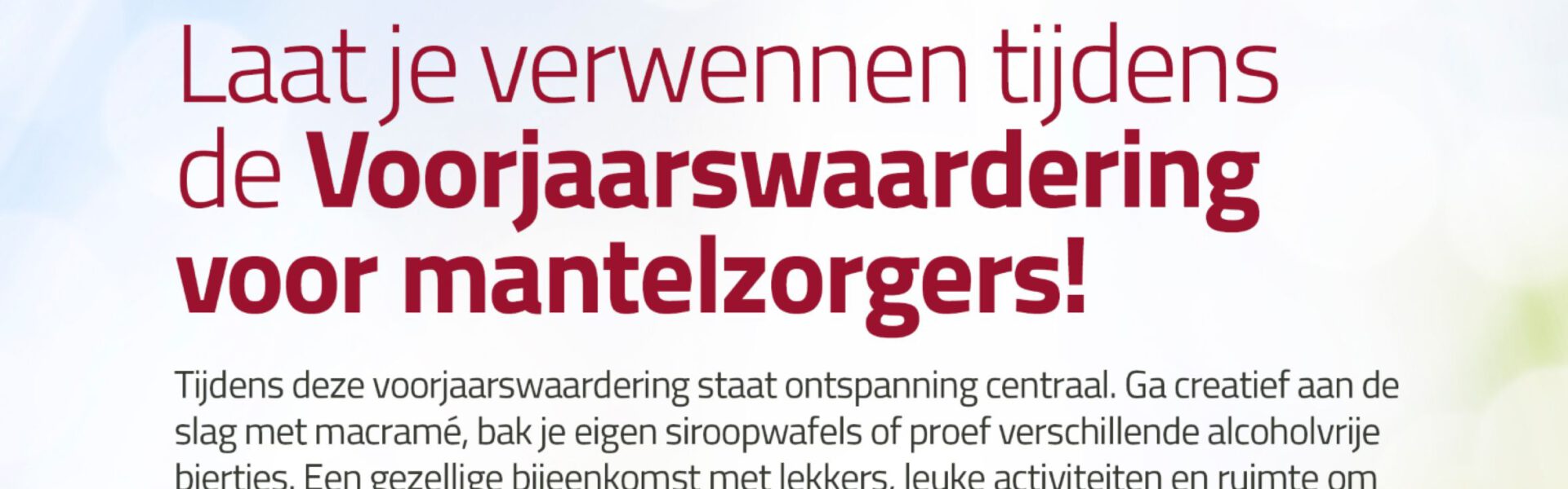 Mantelzorgers zorgen vaak voor een partner, familielid, vriend of buur die hulp nodig heeft. Dit doen zij naast hun werk en andere taken. Hun inzet is heel belangrijk en verdient waardering. De voorjaarswaardering is een manier om mantelzorgers te bedanken en hen een fijne, ontspannende dag te geven.