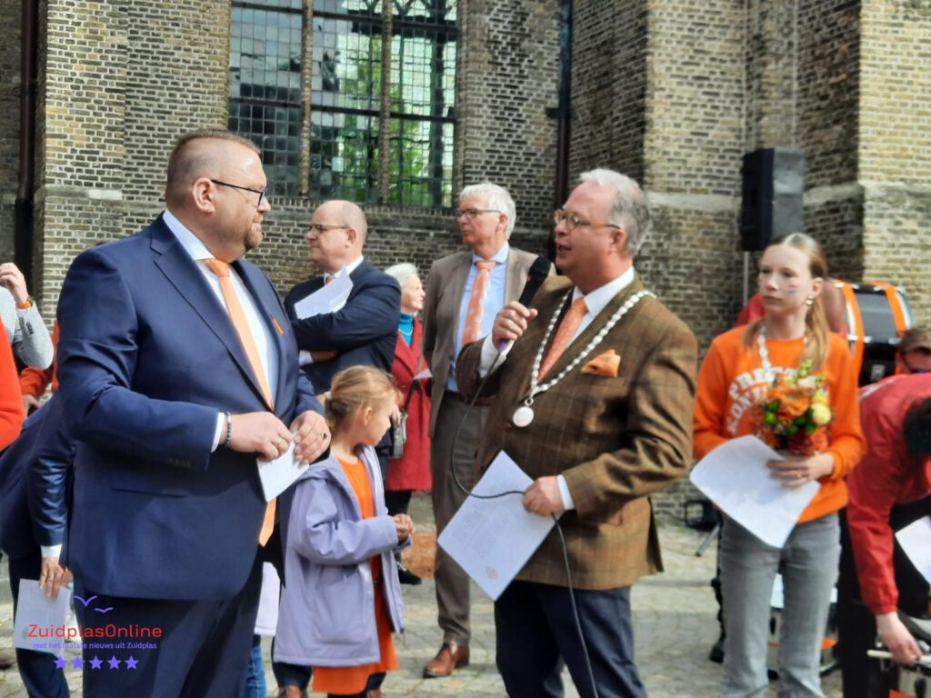 De aubade, m.m.v. Harmonie Kunst na de Arbeid; het harmonieorkest en de slagwerkgroep, vond plaats op het Kerkplein. Burgemeester Han Weber, wethouders Daan de Haas, Frans Klovert, Jan Willem Schuurman en kinderburgemeester Maartje Weijers waren hierbij ook aanwezig. De burgemeester wenste iedereen een mooie koningsdag toe. Na het zingen van het Wilhemus, In een blauw geruite kiel, Leve de Koning en de Zilvervloot was het lied Ben je betoeterd aan de beurt. Uit volle borst werd dit meegezongen door alle aanwezigen. Waar komt dit lied nu toch vandaan? Adri Harteveld weet te vertellen dat het zo’n 60 jaar geleden voor het eerst werd gezongen:” Men vond dat er iets gezongen moest worden wat vrolijker was dan het lied van Zuid-Holland, op de basisschool leerden de kinderen het lied over de Walvis, en toen werd het gezongen bij de aubade.” Marc Boer, voorzitter van de Oranjevereniging, heette iedereen, namens het bestuur en alle vrijwilligers welkom. Zij hebben heel wat uurtjes in de organisatie gestoken en uiteraard op de dag zelf zijn ze ook continu in de weer. Tot slot werd er spontaan nog een couplet gezongen van Ben je betoeterd. Daarna ging het gezelschap uiteen, richting de Dorpskerk, de Kerklaan of de Smidse.