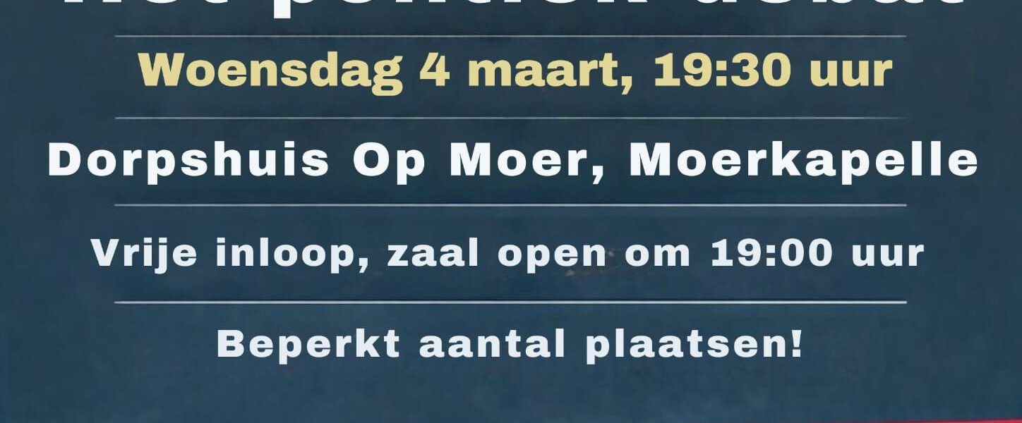 In aanloop naar de gemeenteraadsverkiezingen vindt op woensdag 4 maart een uitgebreide politieke avond plaats in Dorpshuis Op Moer in Moerkapelle. Tijdens deze bijeenkomst gaan lokale partijen met elkaar in debat over thema’s die inwoners van de gemeente Zuidplas direct raken, zoals milieu, sport, jongeren, ouderen, werkgelegenheid en cultuur. De avond duurt van 19.30 tot 21.15 uur en wordt gehouden aan de Raadhuisstraat 40.