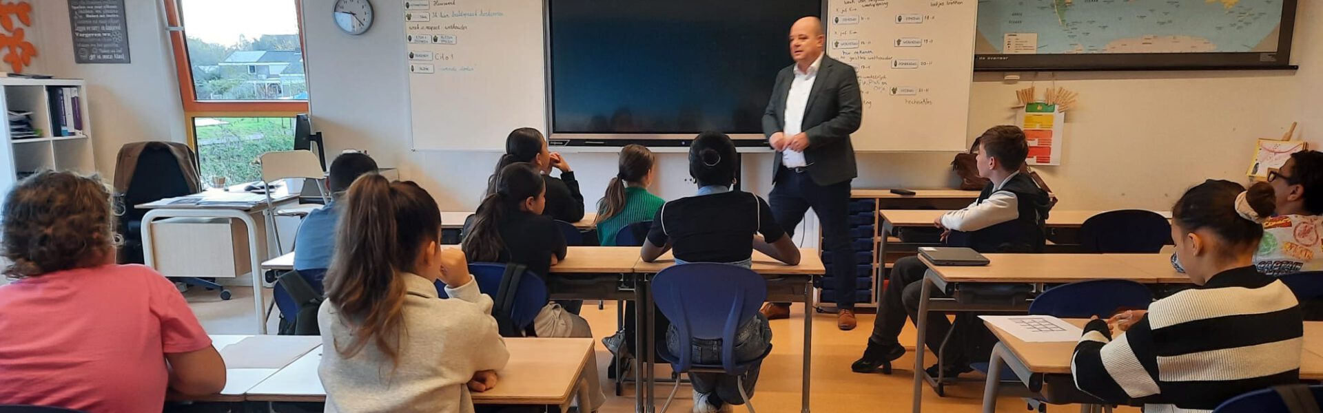 Daaruit ontstond een mooi leergesprek tussen de wethouder en de leerlingen. In het begin nog wat schoorvoetend, maar dankzij de vraagstelling en de voorbeelden van de wethouder kwamen de leerlingen gaandeweg zelf met steeds meer voorbeelden en reacties. Ook de leerkracht werd actief bij het gesprek betrokken.