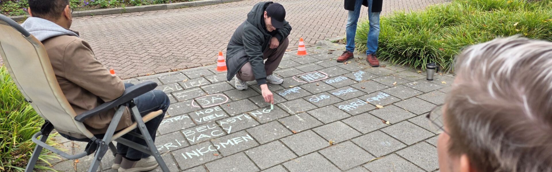 Aan de hand van diverse stellingen gerelateerd aan het thema ‘hospita kamerverhuur’ ging een aantal aanwezigen onder leiding van de initiatiefnemer in de weer met gekleurd stoepkrijt om hun standpunt en overwegingen in te brengen in de discussie. De sfeer was gemoedelijk en ontspannen. Maar niet iedereen was het bij elke stelling met elkaar eens. Waar de één bij de stelling dat ‘kamers alleen zouden moeten worden bewoond door bepaalde doelgroepen’ voluit “Jazeker, heel selectief zijn!” riep, bracht een andere deelnemer in dat hij het daar niet eens mee was omdat dit als discriminerend kan worden opgevat.