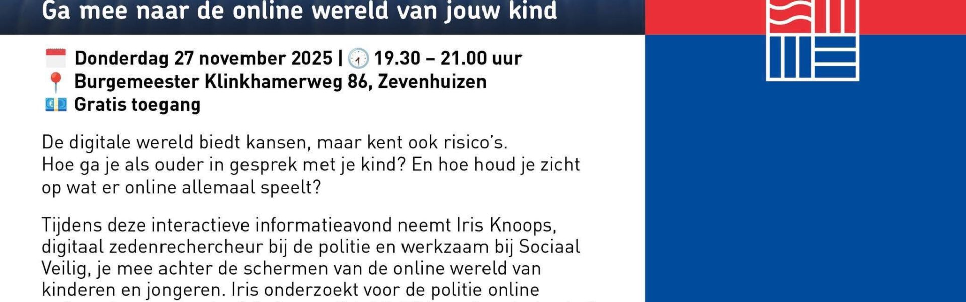 Tijdens de bijeenkomst krijgen ouders praktische tips en inzichten om hun kinderen te helpen veilig en bewust om te gaan met sociale media, games en internetgebruik. De avond richt zich op ouders van kinderen en jongeren vanaf 7 jaar.