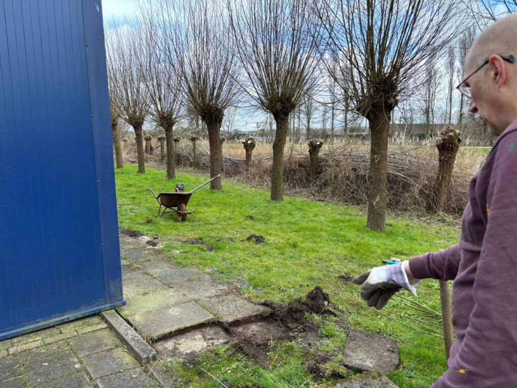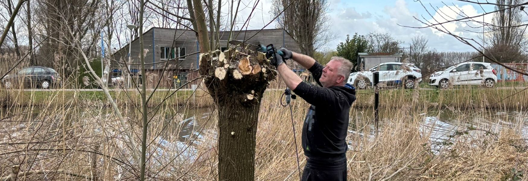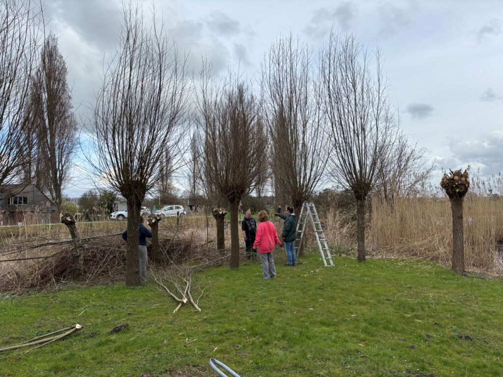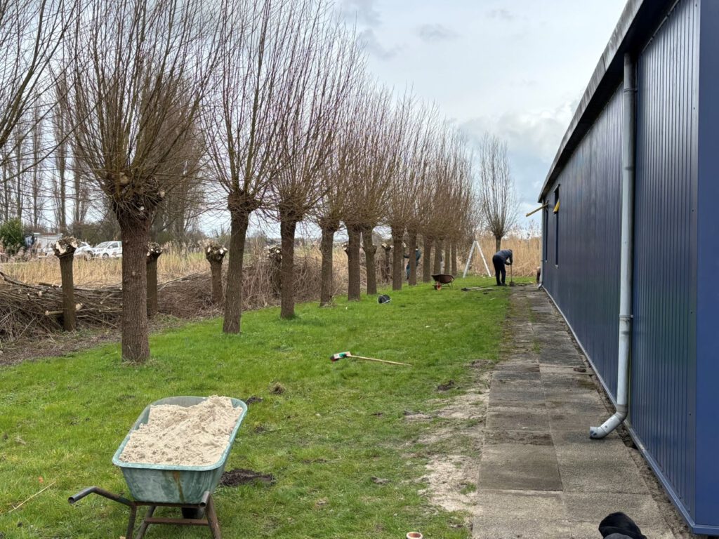 Verspreid over het terrein waren vrijwilligers bezig met uiteenlopende werkzaamheden. In het groen werden wilgen geknot, het kleine bosperceel onderhouden en afvalhout klein gezaagd. Ook werden houtsnippers en grind aangevuld, zodat paden en speelplekken weer goed begaanbaar zijn voor de komende maanden.